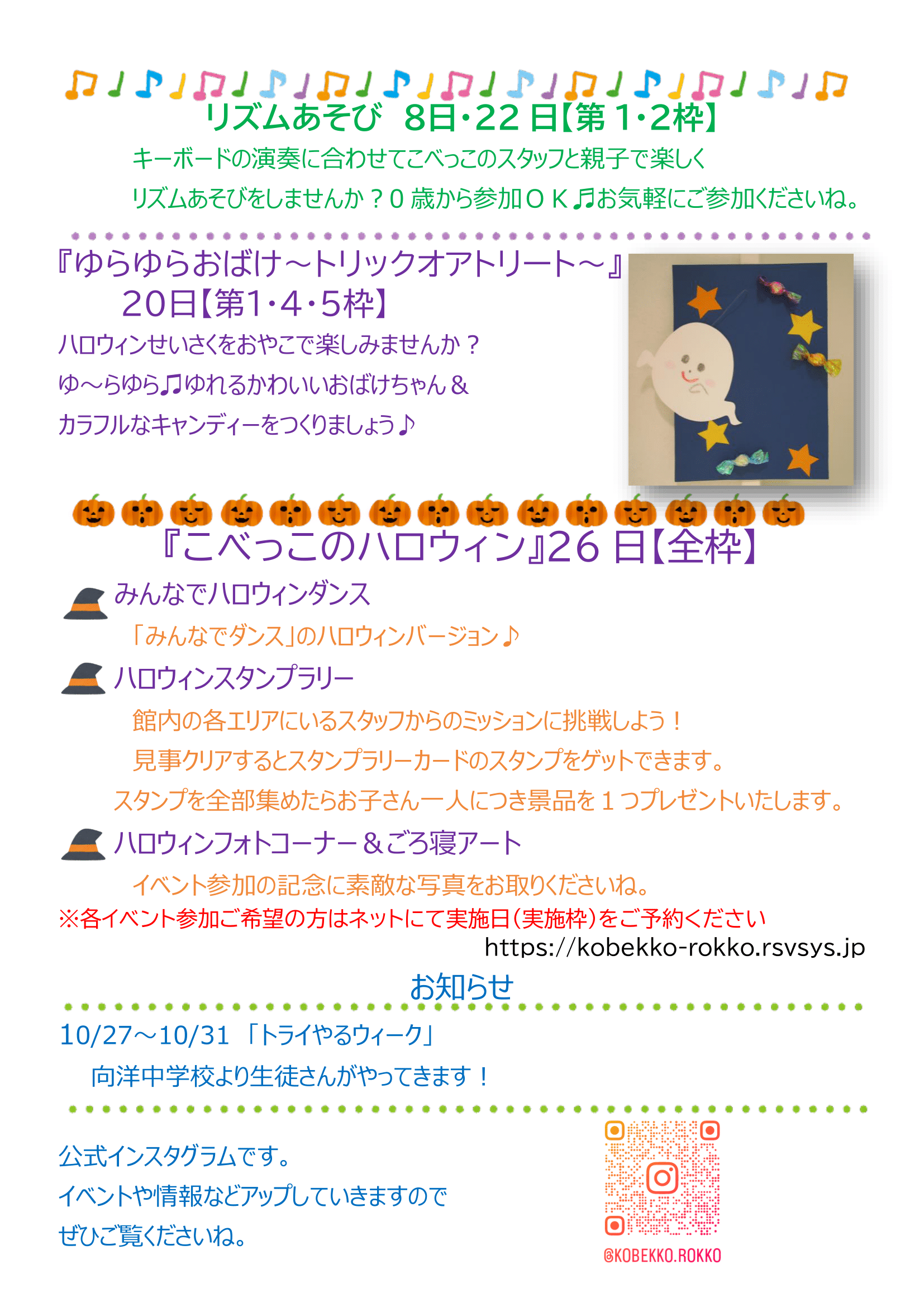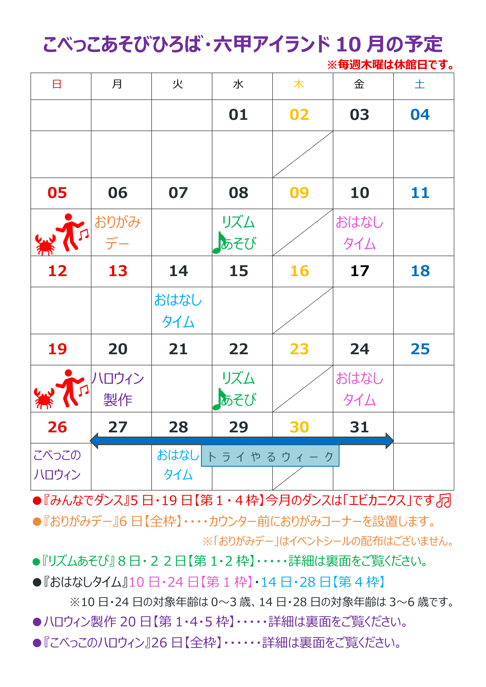 10月の催事内容はカレンダーの通りです。参加を希望される皆さまは、開催日の該当するクール(時間帯)を予約してください。