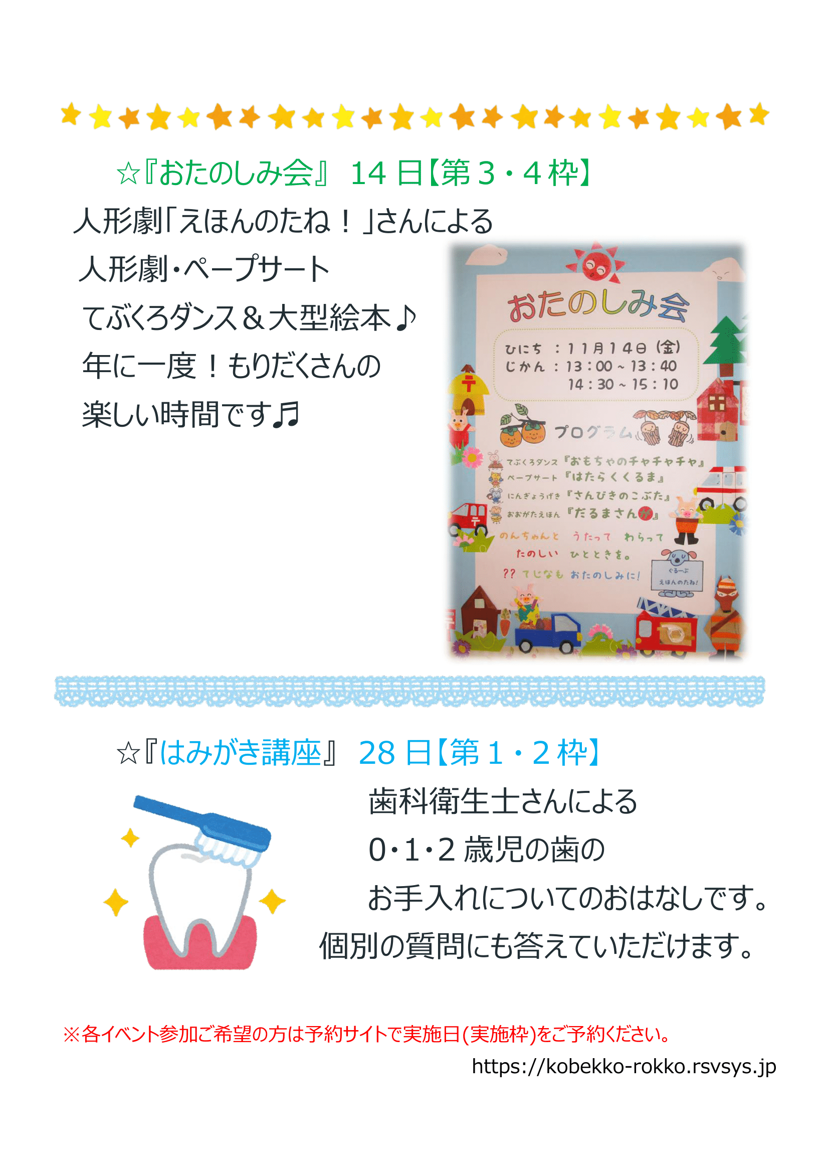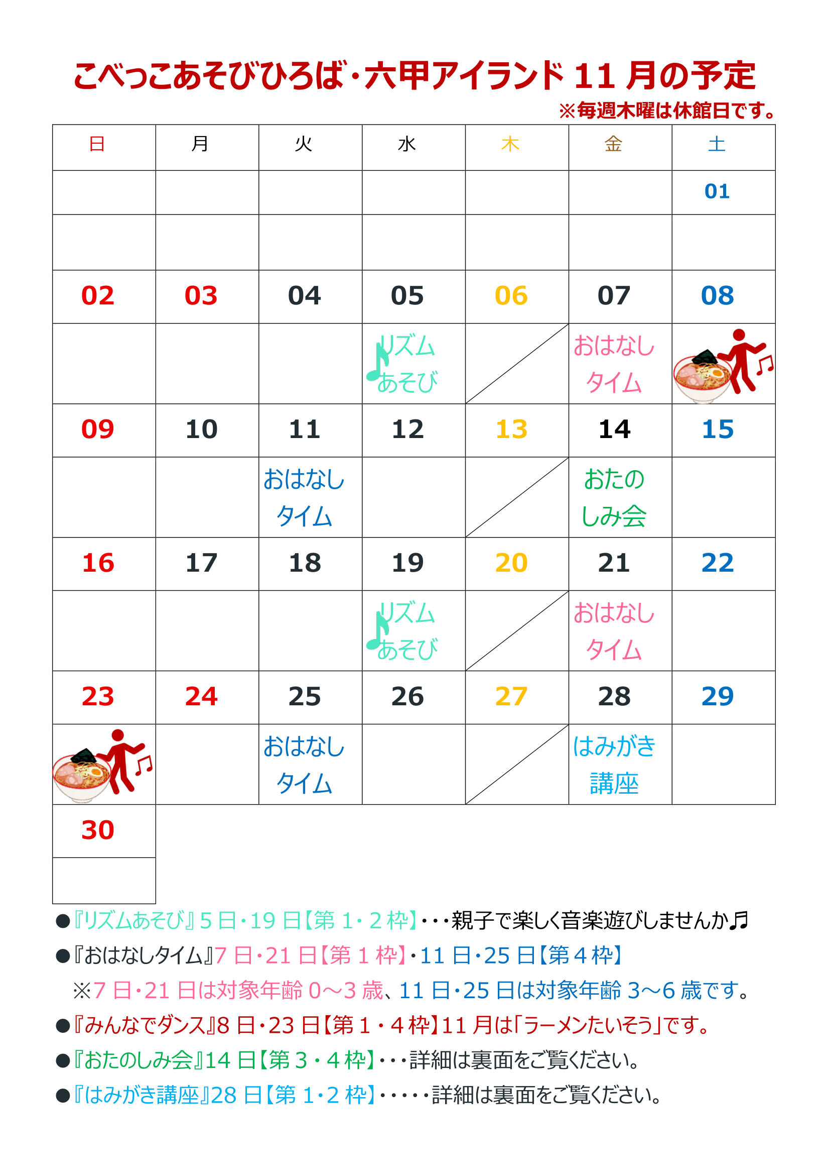 11月の催事内容はカレンダーの通りです。参加を希望される皆さまは、開催日の該当するクール(時間帯)を予約してください。