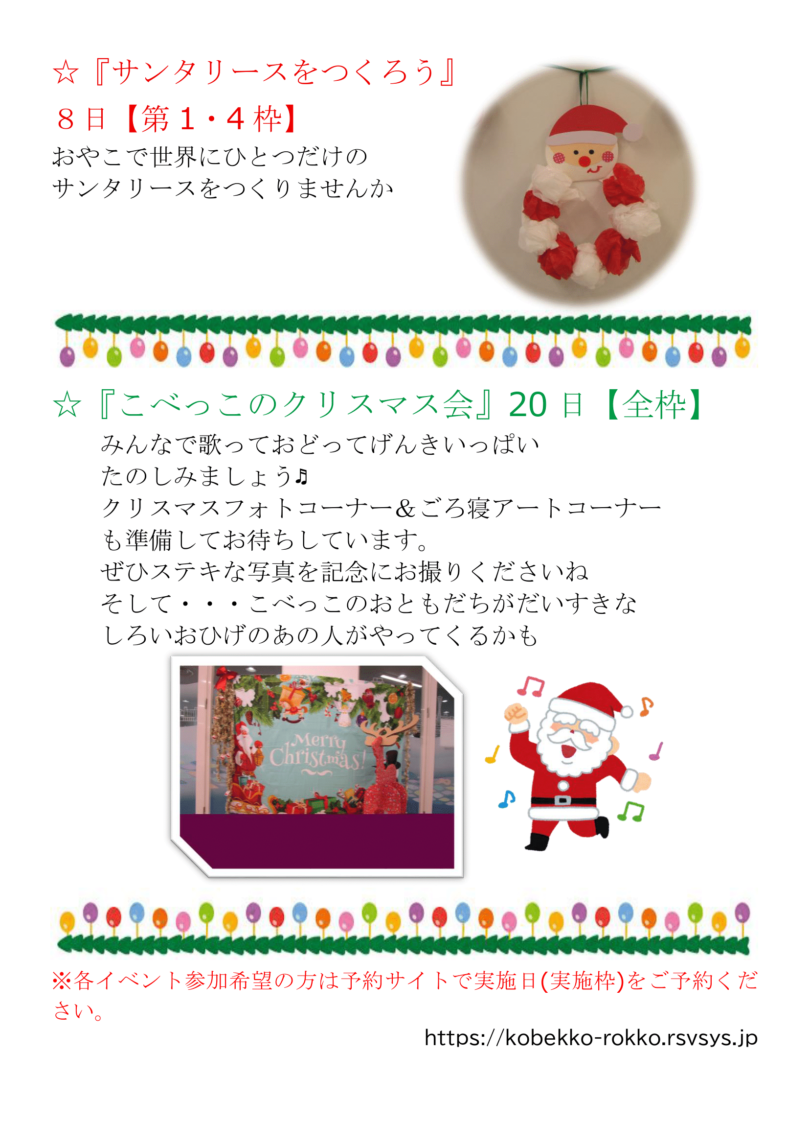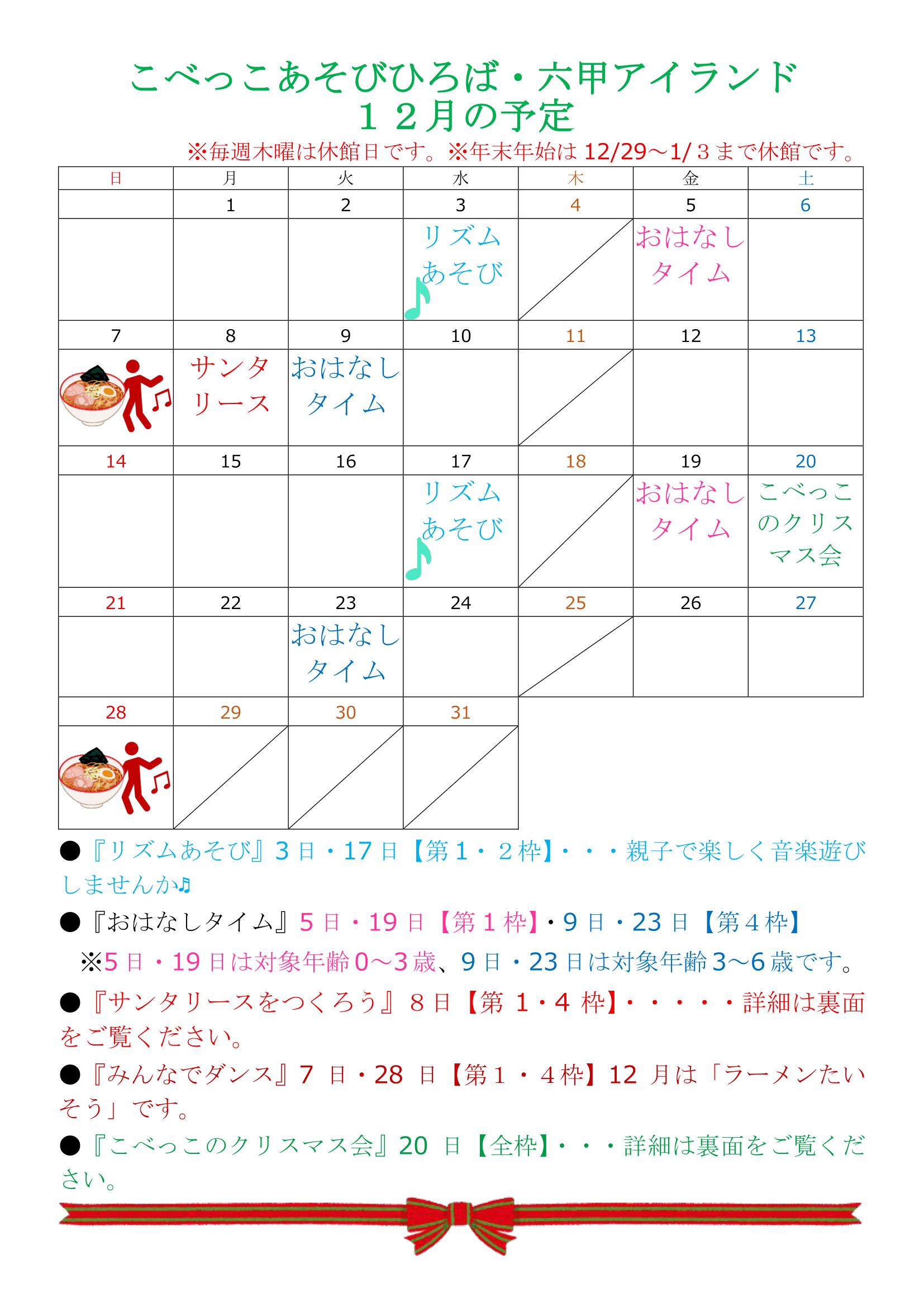 12月の催事内容はカレンダーの通りです。参加を希望される皆さまは、開催日の該当するクール(時間帯)を予約してください。