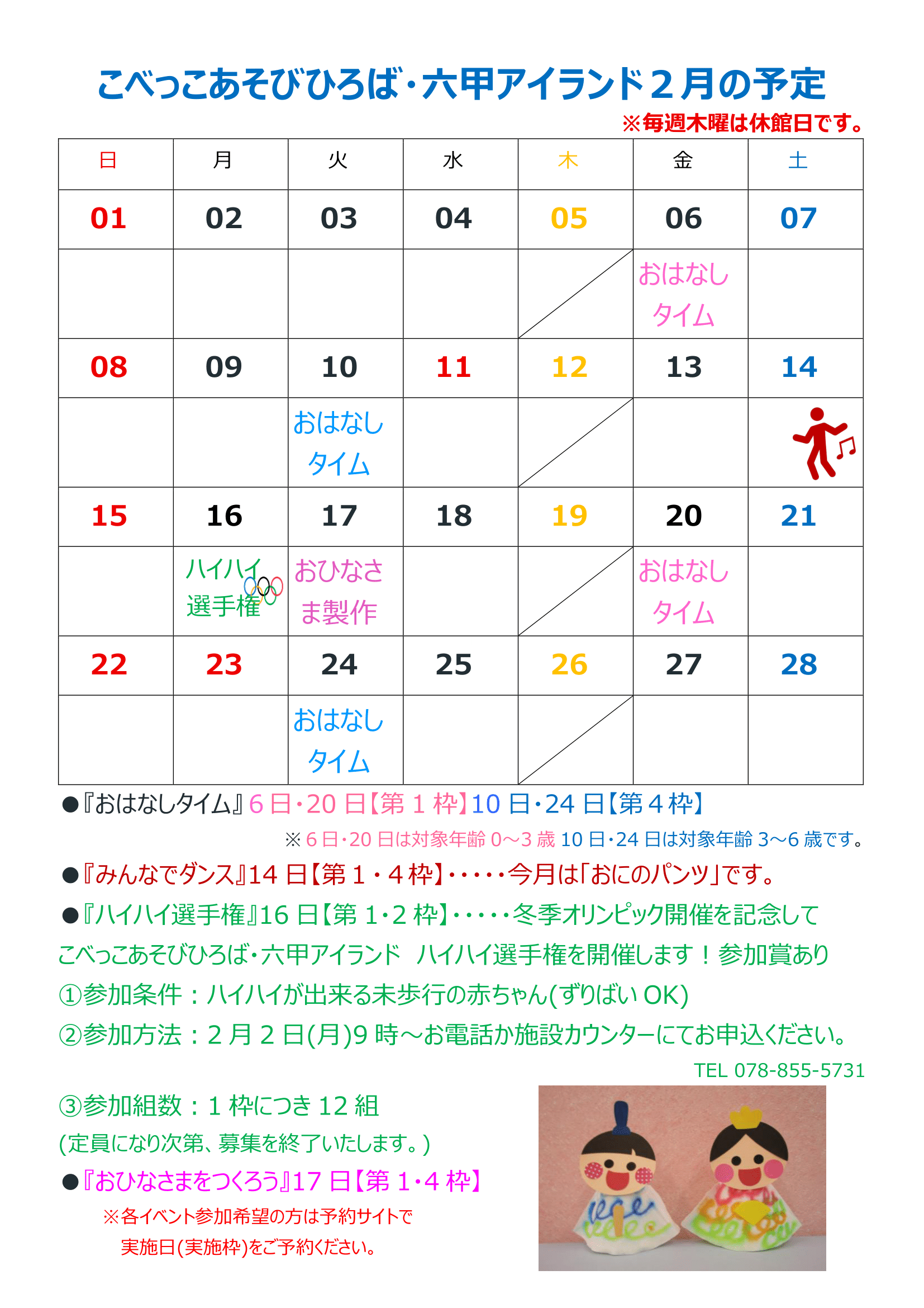 2月の催事内容はカレンダーの通りです。参加を希望される皆さまは、開催日の該当するクール(時間帯)を予約してください。