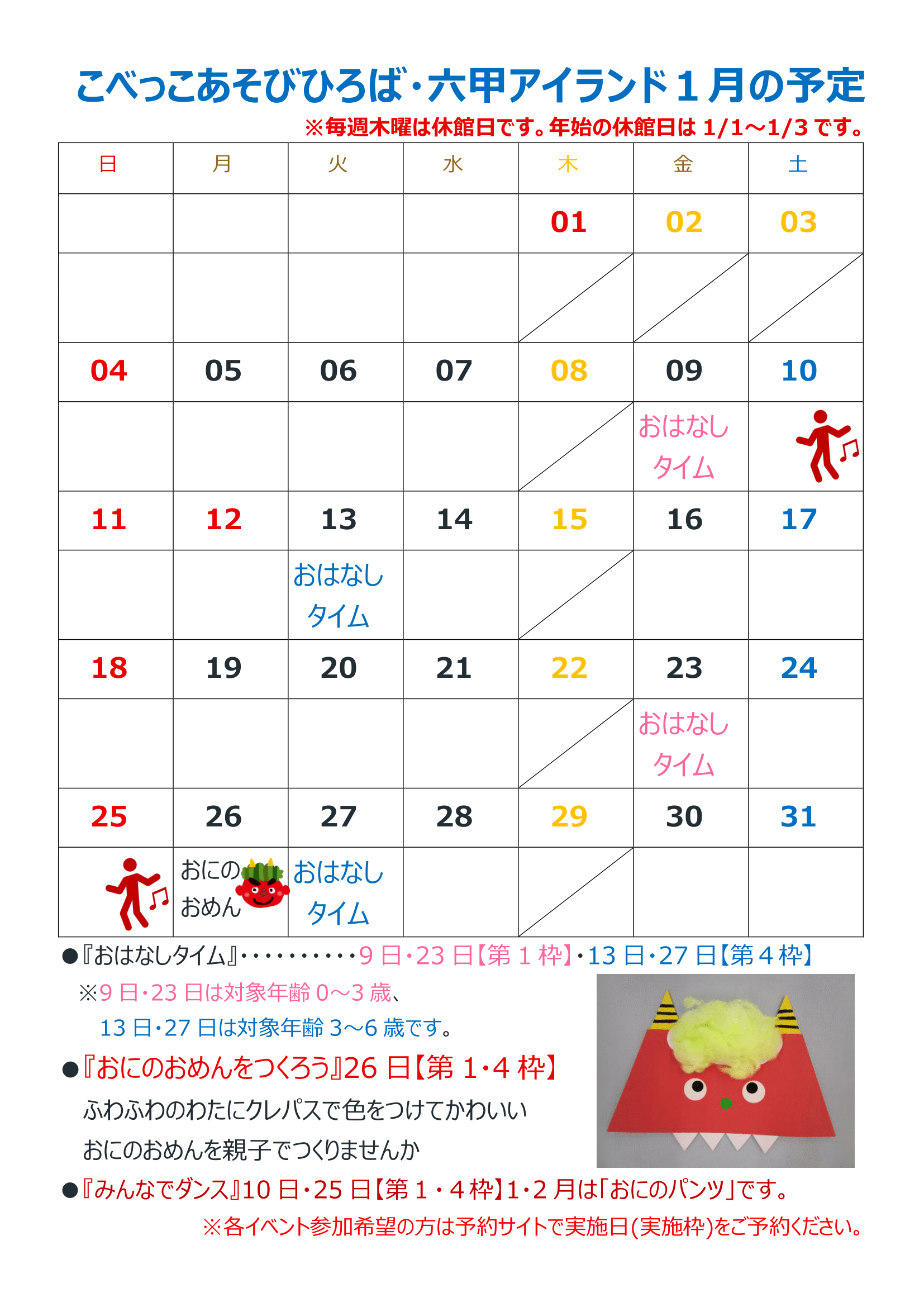 1月の催事内容はカレンダーの通りです。参加を希望される皆さまは、開催日の該当するクール(時間帯)を予約してください。