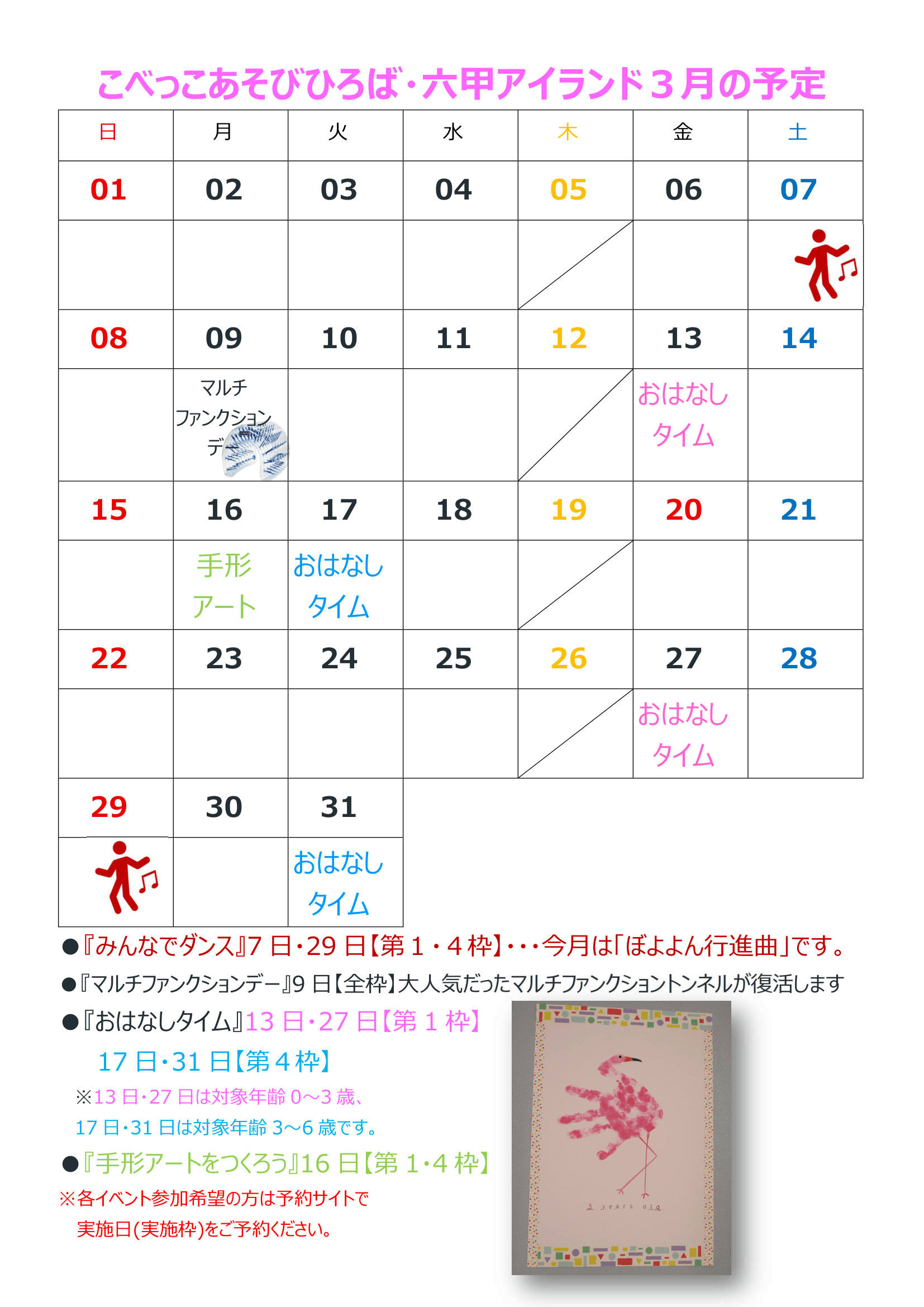 3月の催事内容はカレンダーの通りです。参加を希望される皆さまは、開催日の該当するクール(時間帯)を予約してください。